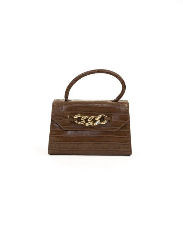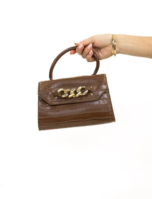 De tas heeft een slangen/croco print en is afgewerkt met een gouden ketting aan de tas. De tas heeft van binnen 1 vak en is zowel als handtas en als cross body te dragen.