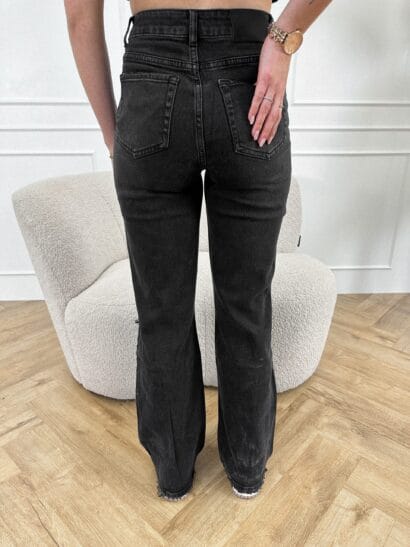De Nyna broek is een wide leg model en valt high waisted. De broek heeft 2 kontzakken, 2 steekzakken aan de voorkant en heeft als detail scheuren op de knie.