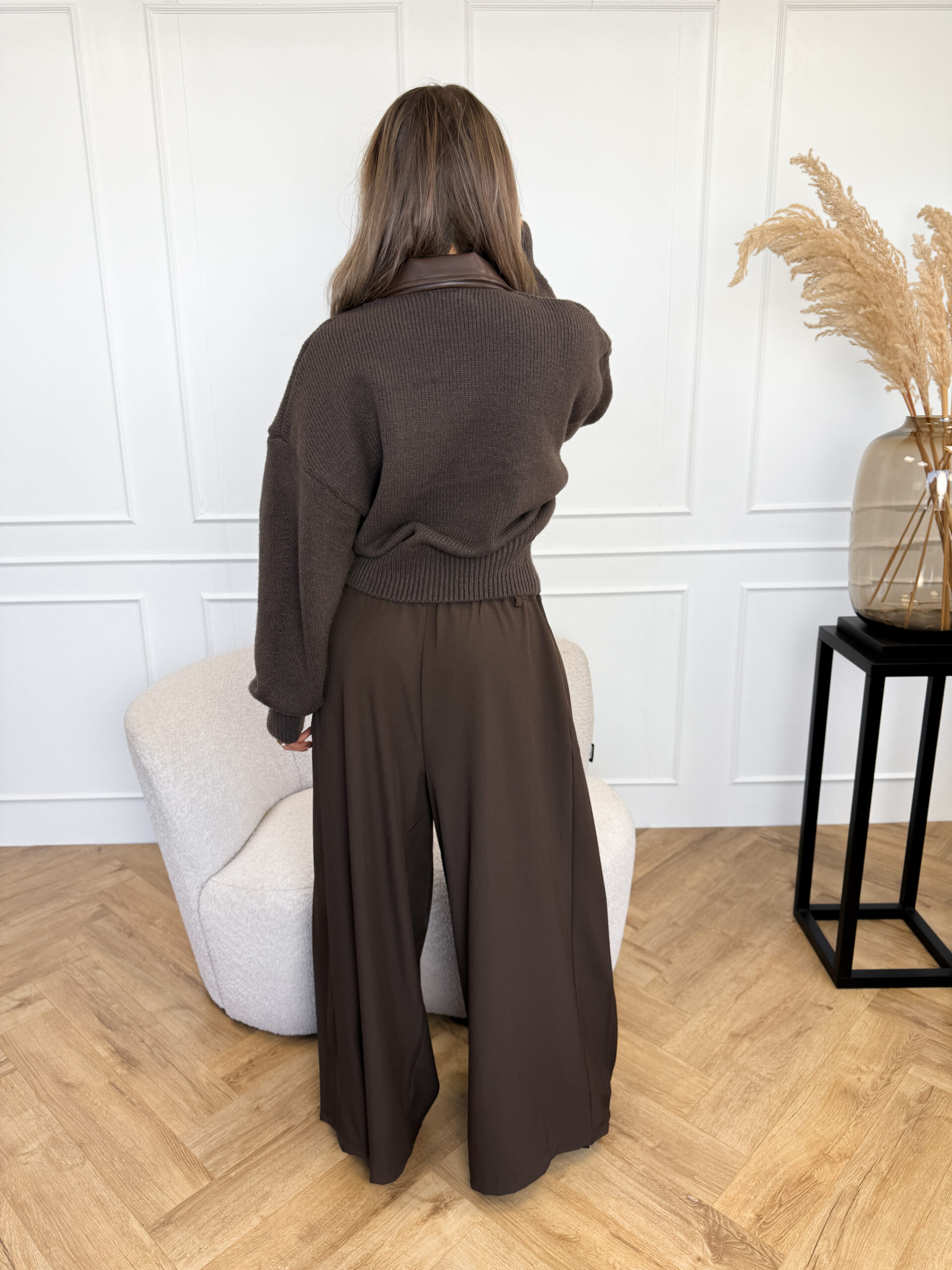 Het model is 1.63 m en draagt maat one size. (Het model heeft lange benen, wij raden de pantalon tot 1.73m aan.)