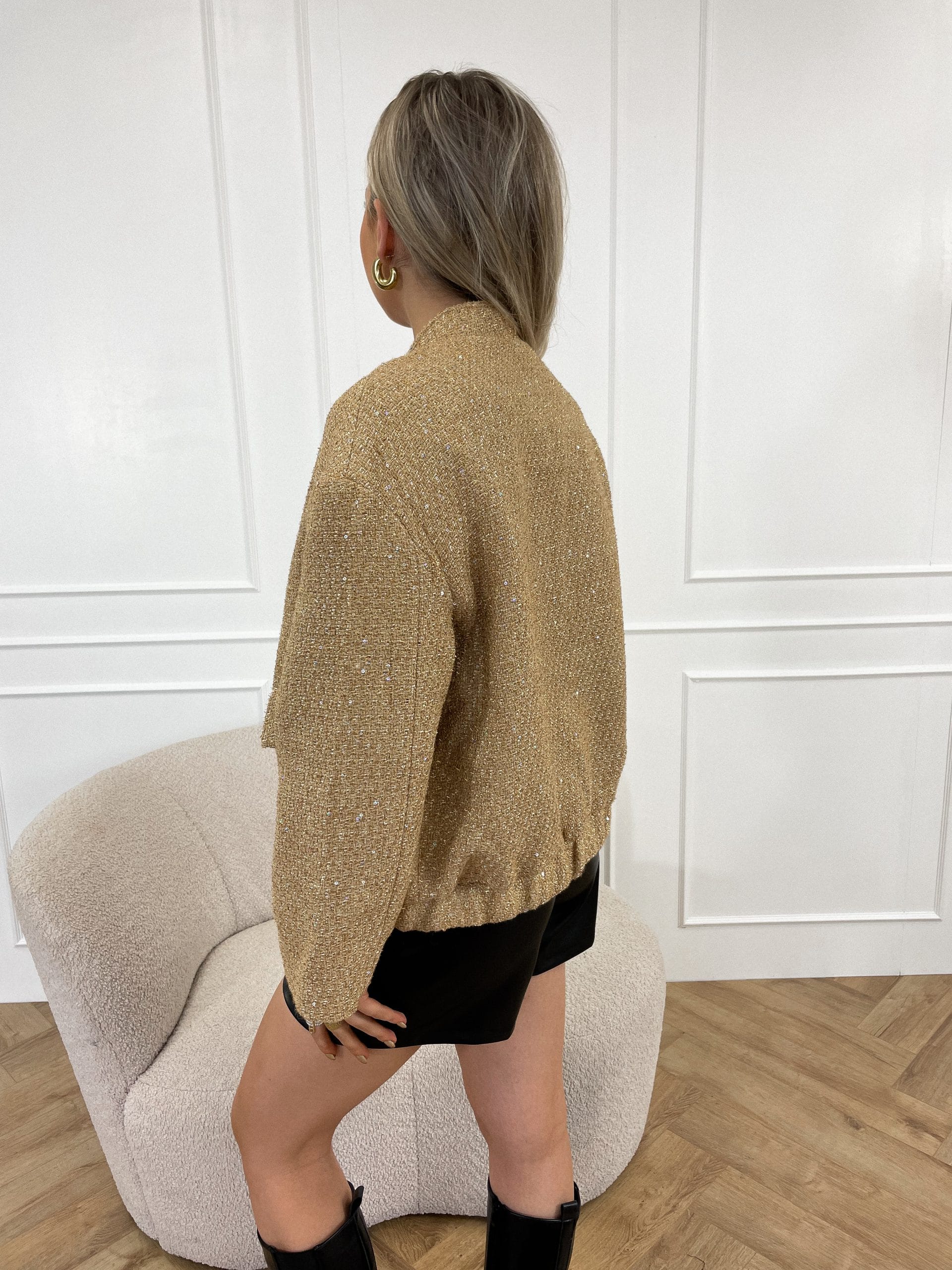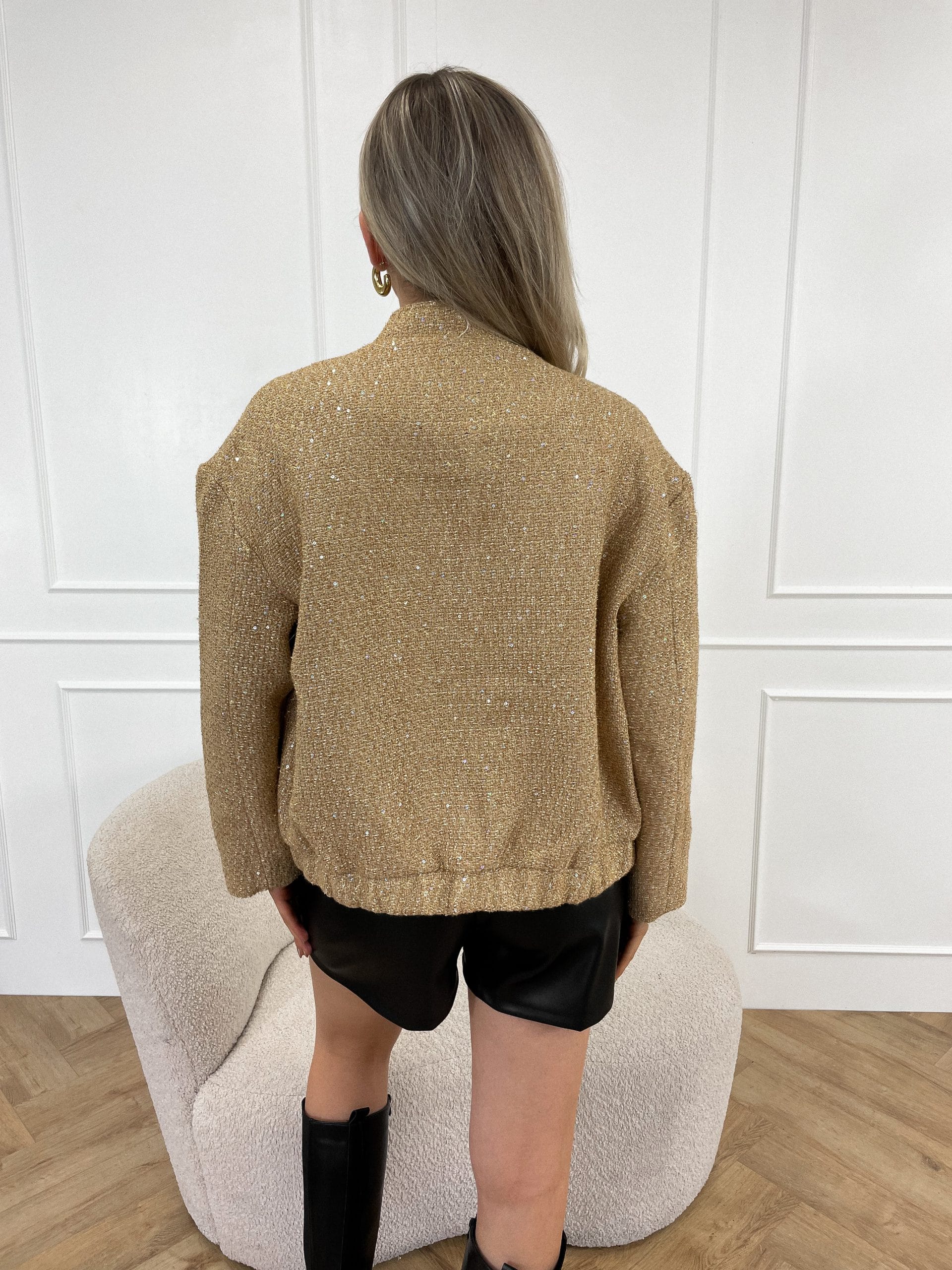 Perfect statement piece! Het jasje is een bomberjack model en  het glinstert door de toevoeging van kleine schijfjes, oftewel pailletten. Het bomberjack in een glinsterende gouden kleur, combineert stijlvolle flair met een casual uitstraling, waardoor het geschikt is voor zowel feestelijke gelegenheden als een casual look!
