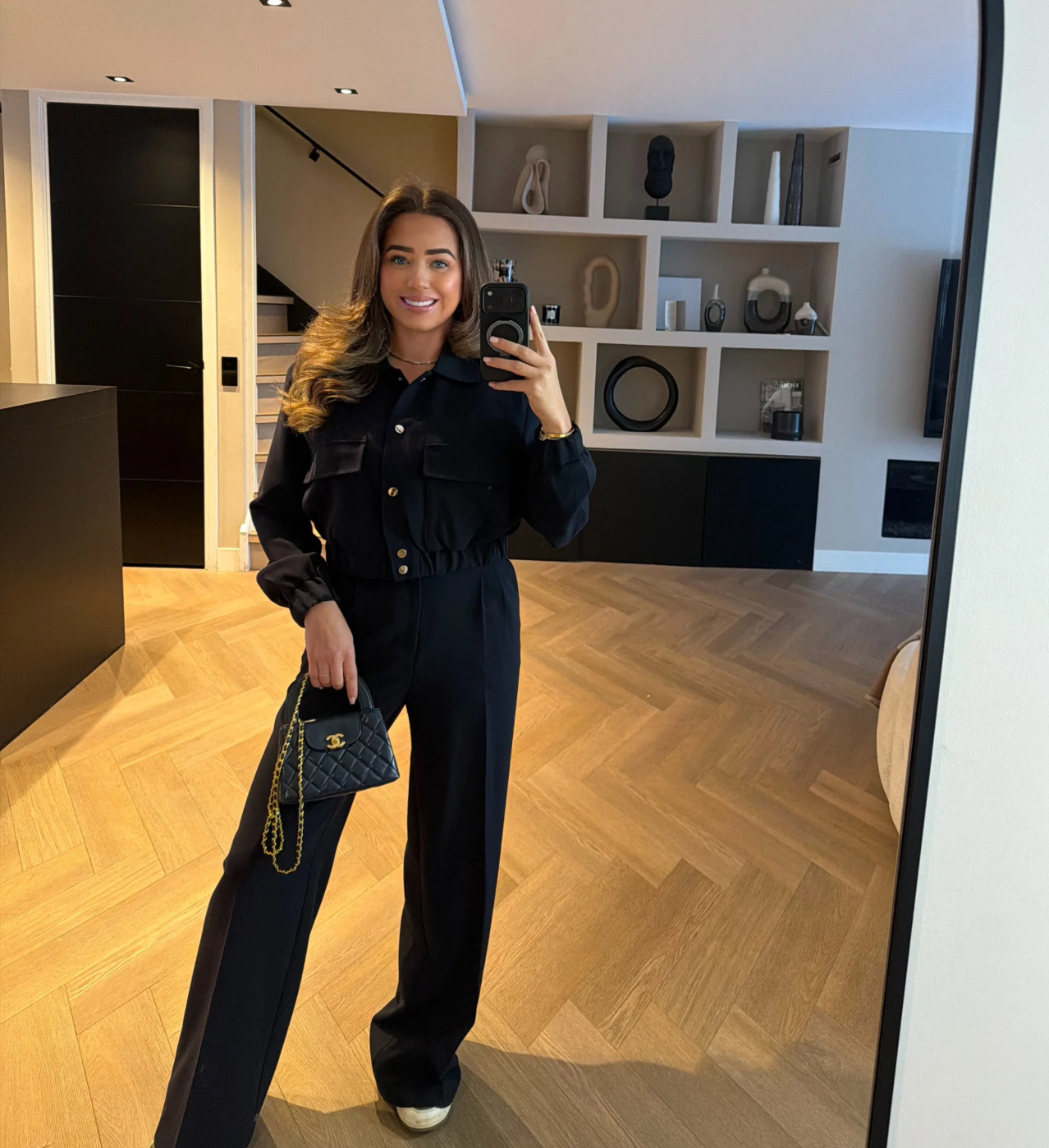 Gemeten als: Lengte broek 108 cm en taille 71 cm. Top oksel tot oksel 55 cm en lengte 61 cm.