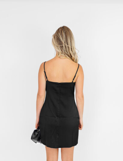 Stap stijlvol de spotlight in met de Eleanoor jurk in elegant zwart. Deze jurk valt op door het speelse strik detail dat zorgt voor een feminine touch, gecombineerd met de luxe uitstraling van soepel vallende satijnen stof. Perfect voor een avondje uit, feest of speciale gelegenheid. De Eleanoor jurk is verkrijgbaar in twee tijdloze kleuren, zodat je altijd jouw favoriete look kunt kiezen. Draag ‘m met heels en subtiele accessoires voor een onvergetelijke outfit.