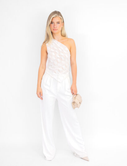 De Emilia one shoulder top is jouw nieuwe summer fave! Deze witte kanten top met one shoulder cut geeft instant fashion vibes en laat je outfit er moeiteloos chic uitzien. De speelse punt aan de onderkant zorgt voor een edgy touch en maakt ‘m perfect voor elke stijl. Combineer ‘m met een denim short voor een casual day look of met een witte pantalon voor die clean, all-white outfit. Of je nu naar een feestje gaat, een terrasje pakt of op vakantie bent met de emilia top steel jij de show.