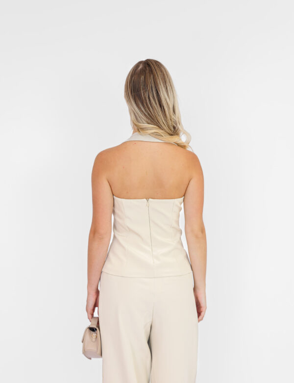 Deze beige haltertop voor dames combineert stijl, comfort en eenvoud in één elegante look. De top heeft een aangesloten silhouet dat je figuur mooi accentueert en is voorzien van een rits in de zij voor een gladde, flatterende fit. De neutrale beige kleur geeft een luxe, minimalistische uitstraling en maakt het stylen super easy. Draag de top solo voor een frisse zomerlook of combineer ‘m met onze bijpassende beige pantalon voor een stijlvolle co-ord set. Perfect voor zowel casual chic als speciale gelegenheden.