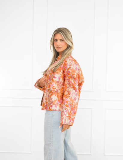 Op zoek naar het perfecte jasje voor Koningsdag én daarna? Dit stijlvolle oranje bomberjasje met jacquard print is een echte eyecatcher. De print combineert warme tinten zoals lila, beige en oranje met subtiele lichte gouden accenten, wat zorgt voor een luxe uitstraling. De zilveren knopen geven het jasje een moderne touch.
