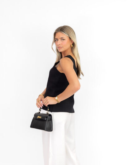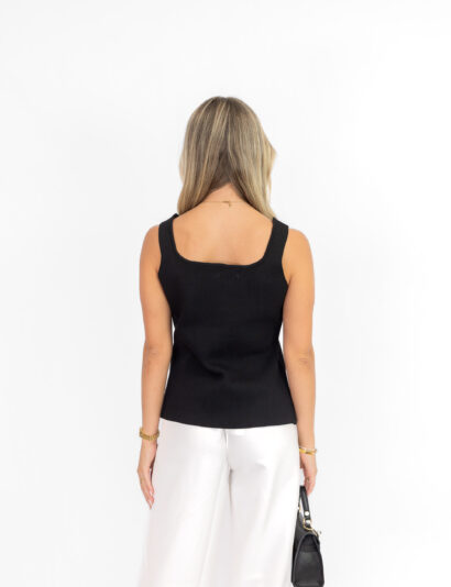 De Lyona top in zwart is de perfecte mix van comfortabel en chique! Deze top heeft bredere bandjes voor extra draagcomfort en een unieke uitstraling. De gouden knopen aan de voorkant geven de top net dat beetje extra glam, zodat je een subtiele luxe vibe heb. Verkrijgbaar in drie kleuren bruin, beige en zwart. Zodat je eindeloos kunt variëren met je outfits. Perfect te combineren met een high-waisted broek of een cute mini-rok voor een ongedwongen, maar toch chique look.