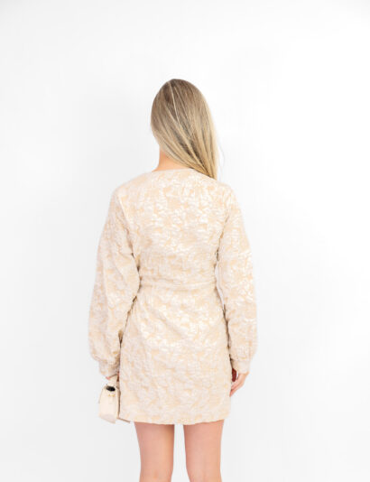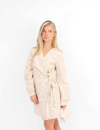 De Marly jurk in beige is een stijlvolle omslagjurk met een verfijnde jacquard print. Dankzij de flatterende pasvorm en de strik in de taille benadrukt deze jurk op een elegante manier je taille. De zachte beige kleur geeft de jurk een tijdloze uitstraling, perfect voor zowel een casual dagje uit als een chique gelegenheid.