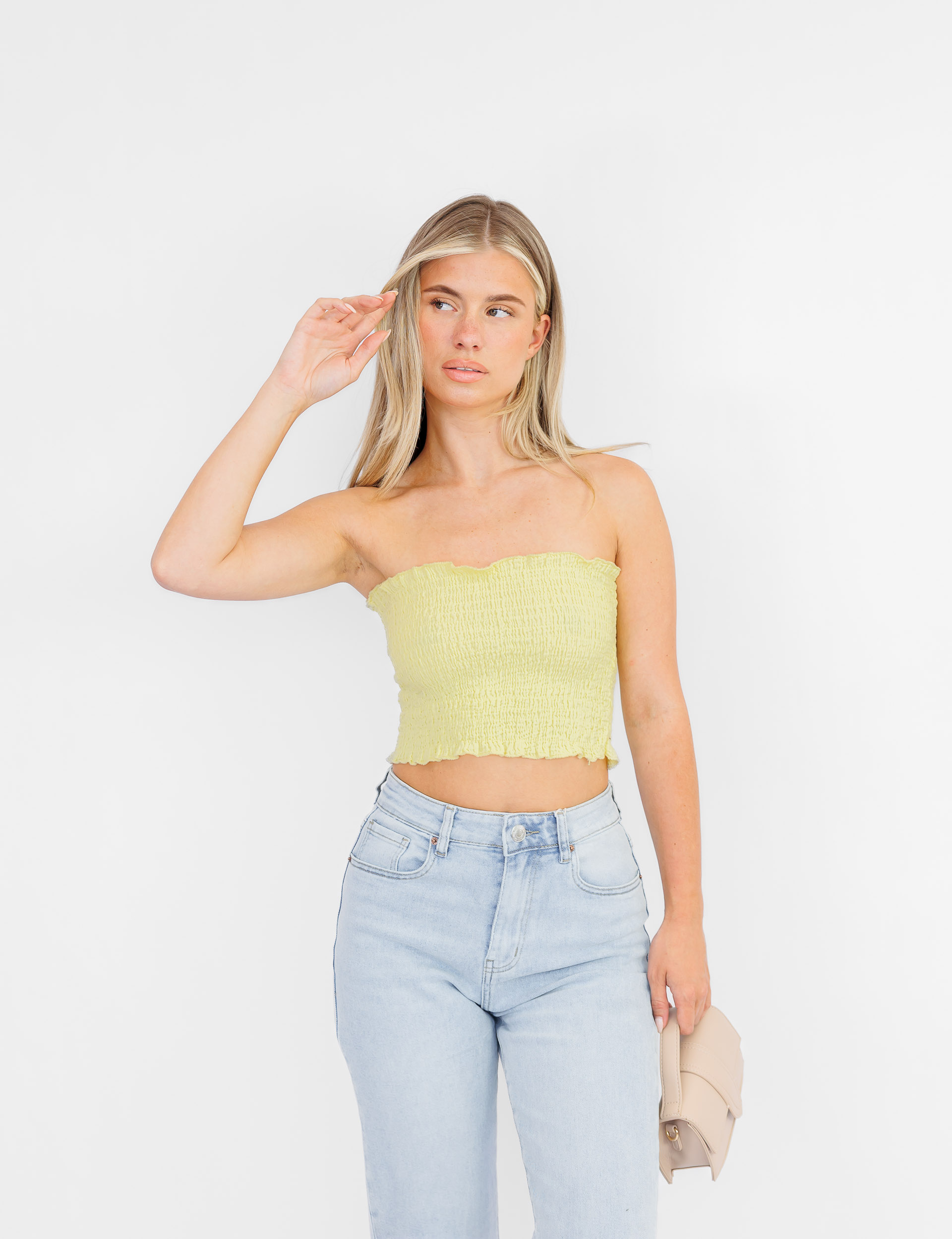 Of je nu een festival outfit samenstelt, iets luchtigs zoekt voor op vakantie of een basic top nodig hebt voor je dagelijkse look: met de Oona bandeau top in geel zit je altijd goed.