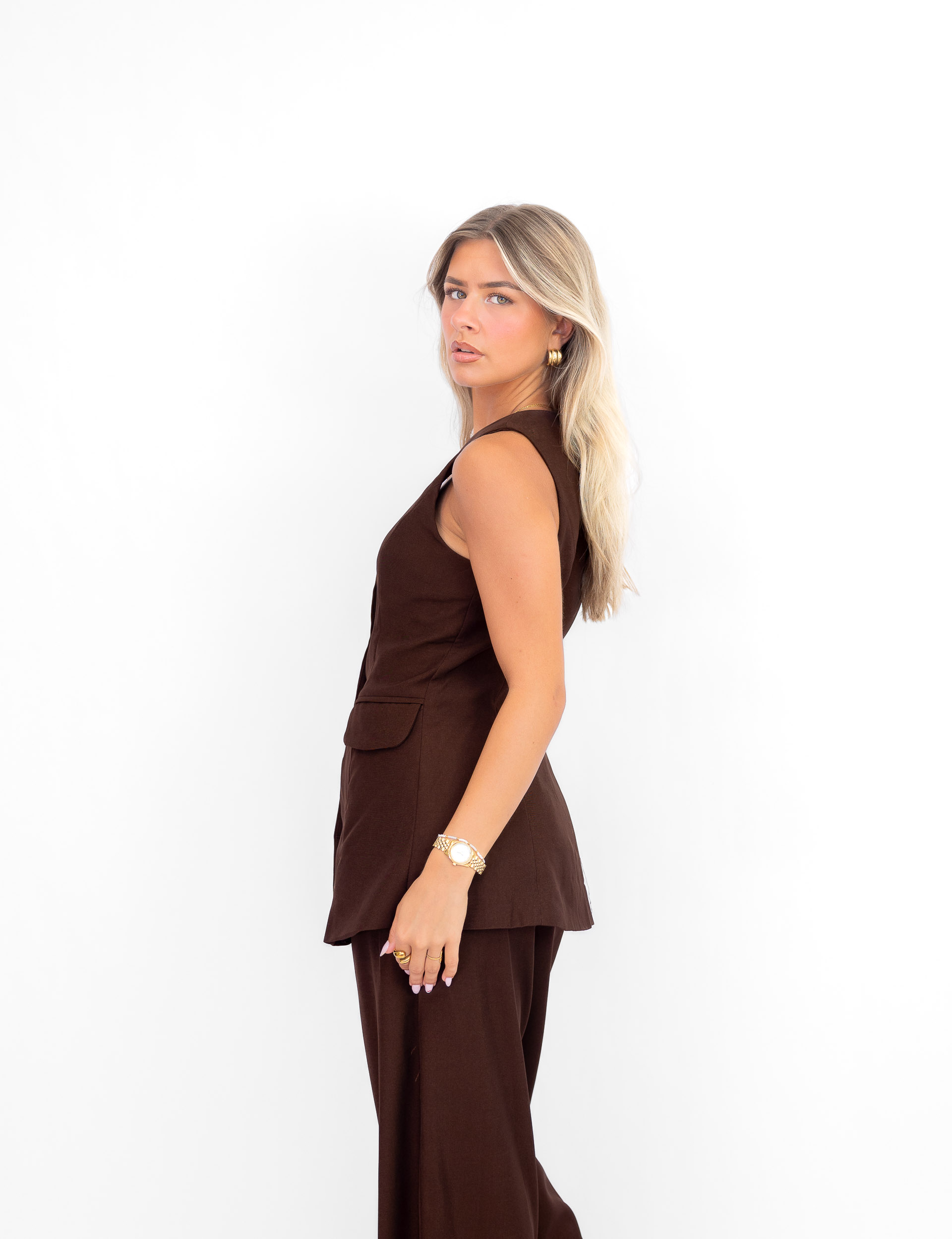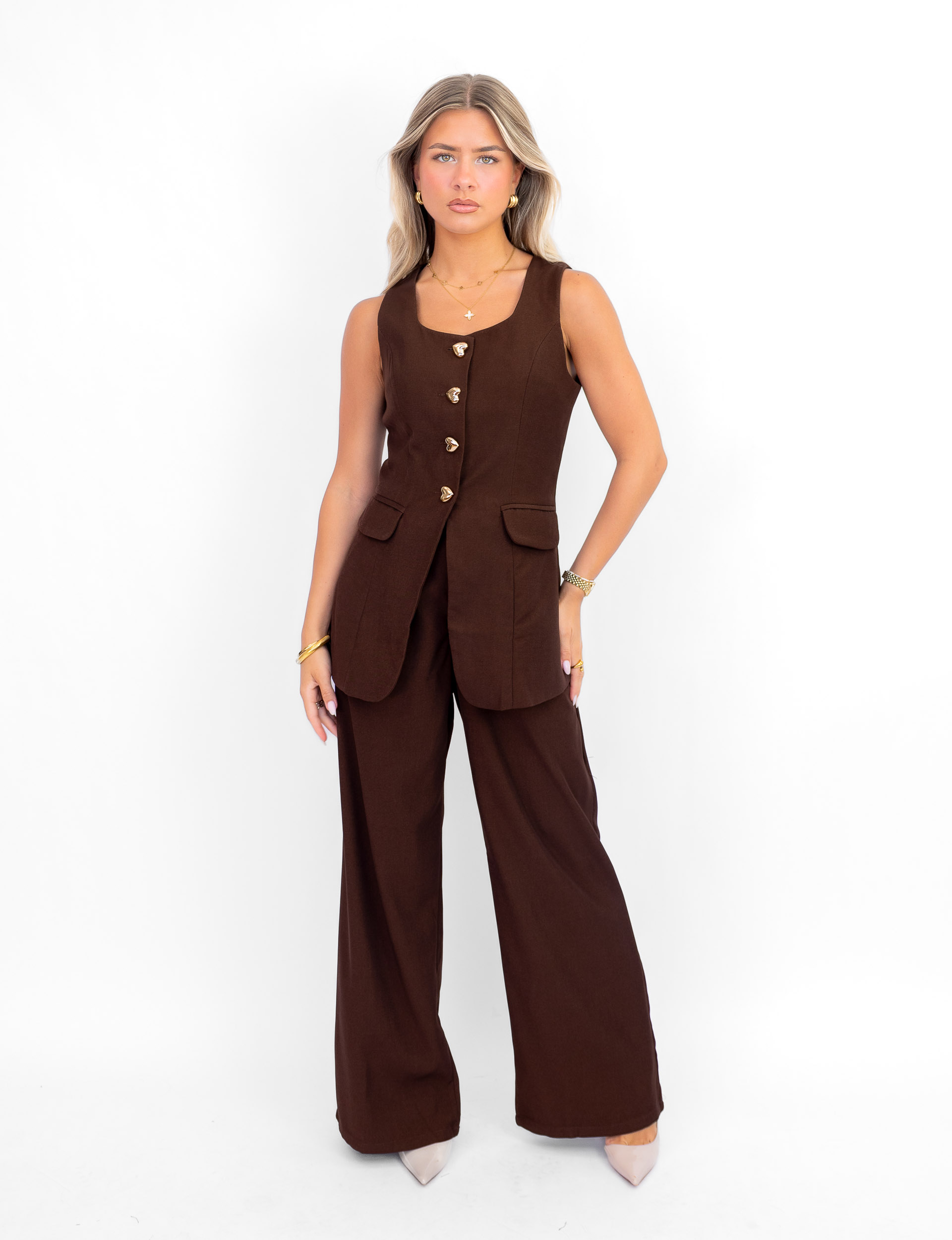 De Shirley set bruin is een bruin gilet met gouden knopen en een bijpassende pantalon. De set is perfect voor een date night en geeft jouw die absolute stunning look! De set is verkrijgbaar in 2 kleuren.