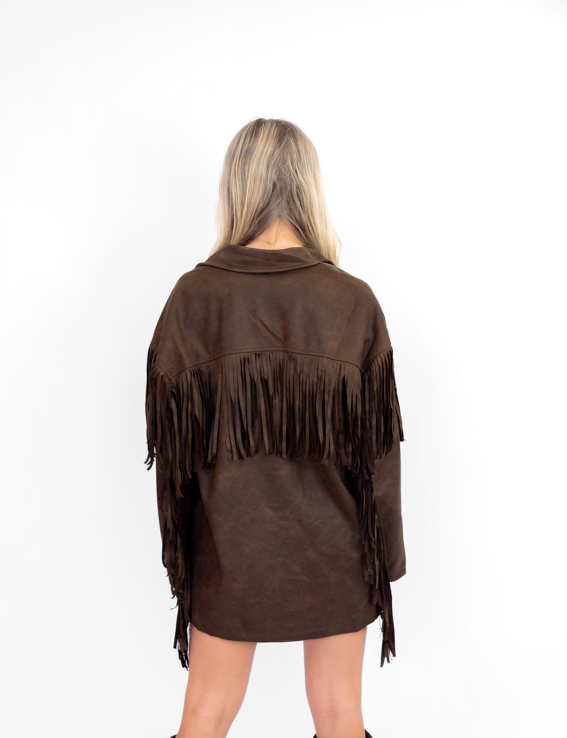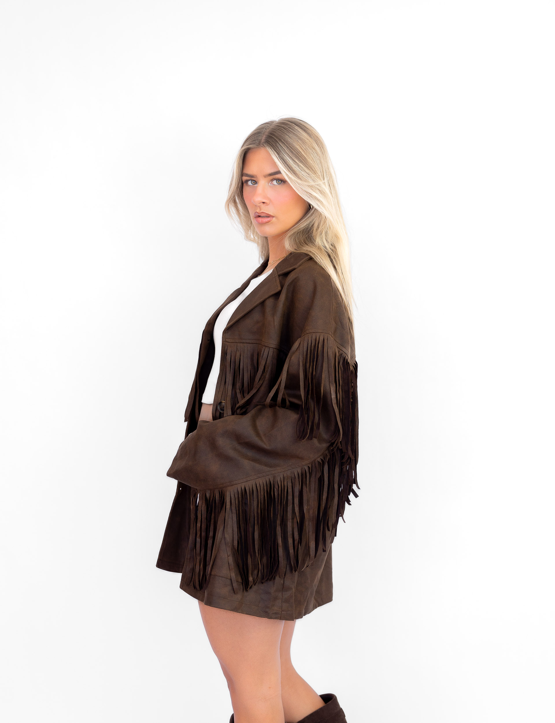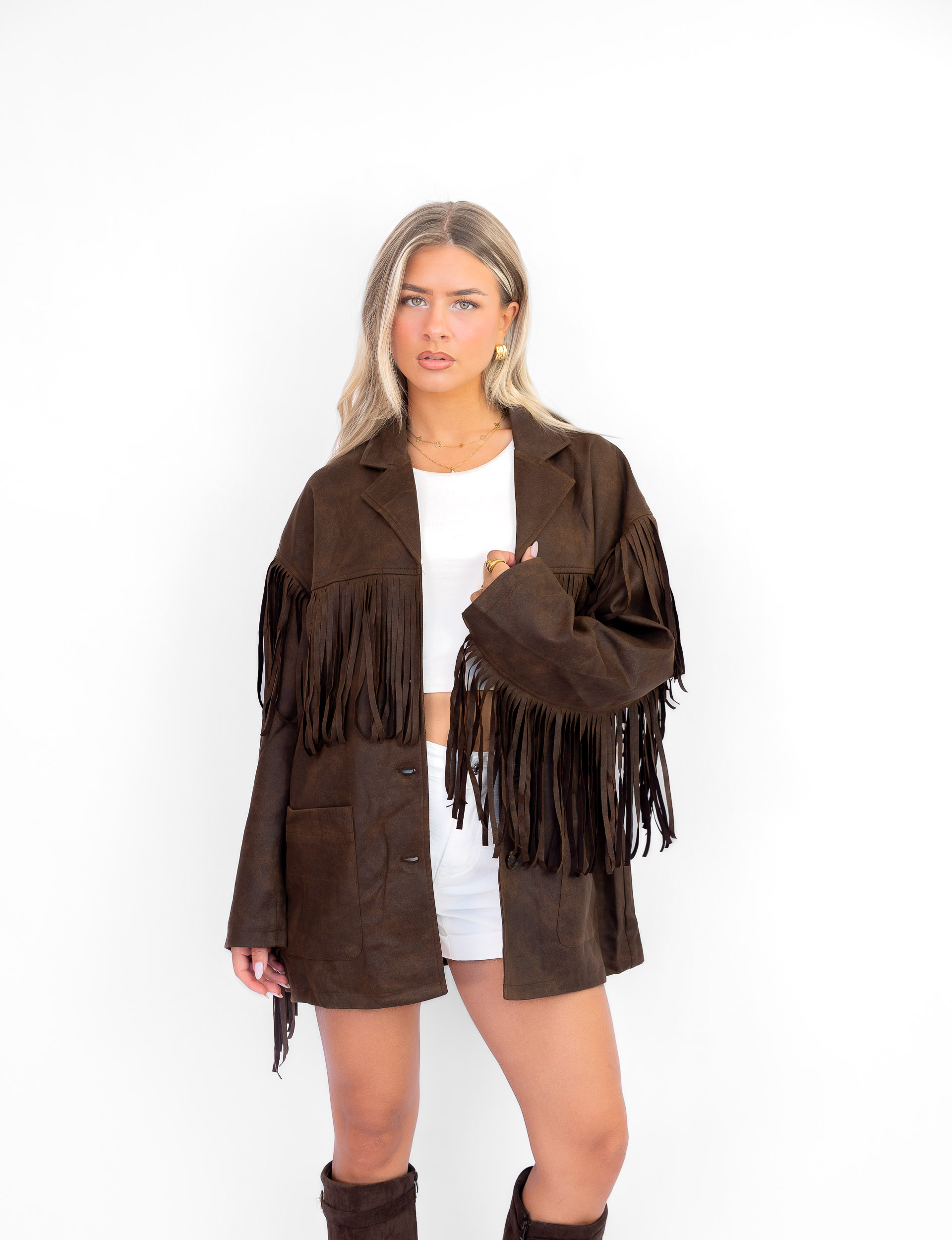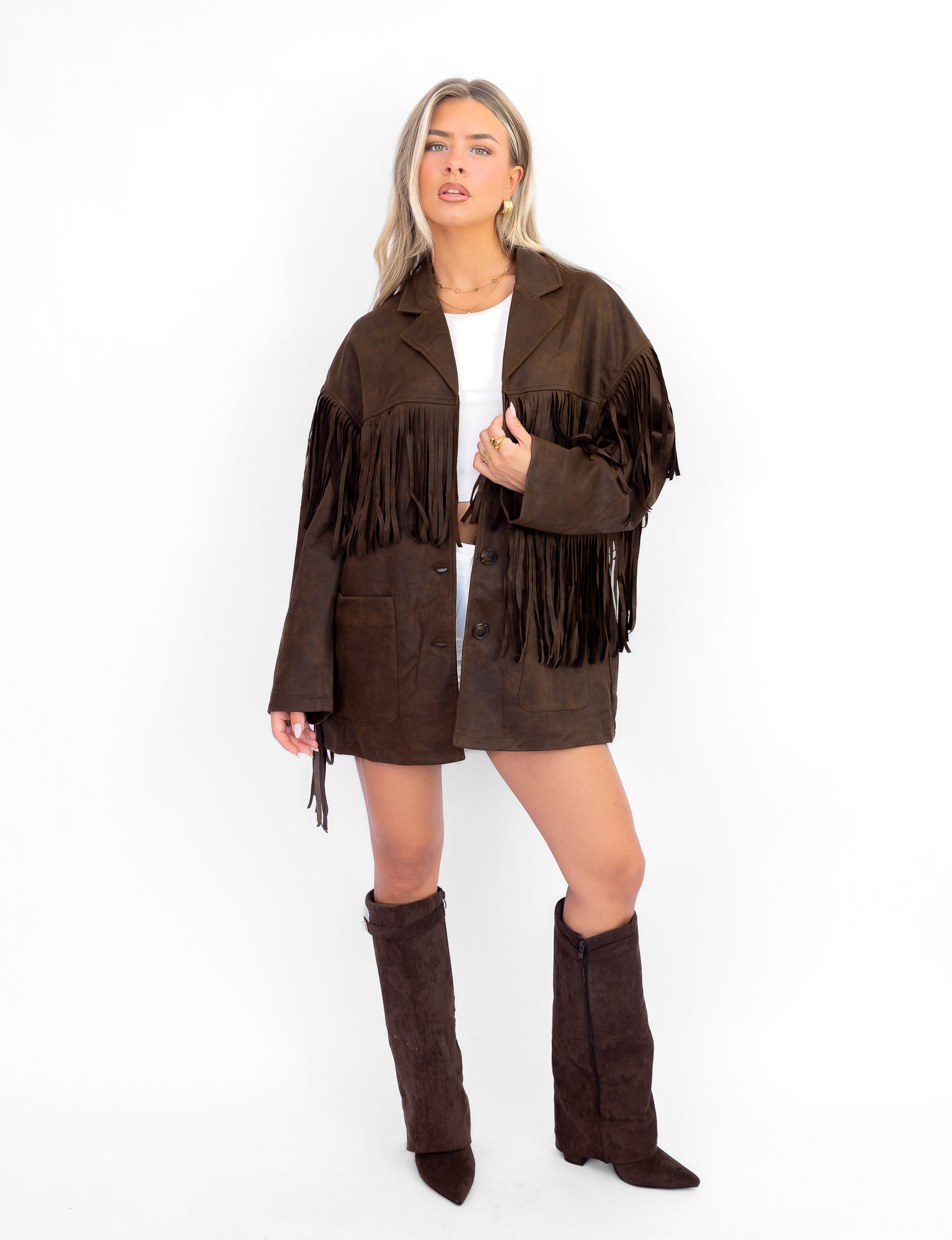 Festival vibes only met de sierra jas in beige! Deze suede-look franje jas is dé ultieme statement piece voor het festivalseizoen (en ver daarbuiten). De oversized fit geeft ‘m een effortless cool uitstraling, terwijl de speelse franjes zorgen voor die boho touch waar we allemaal van houden.