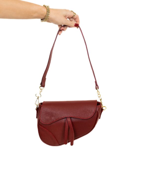 De Fee tas in bordeaux heeft gouden details en sluit met een ritssluiting en heeft ook druk knopen.