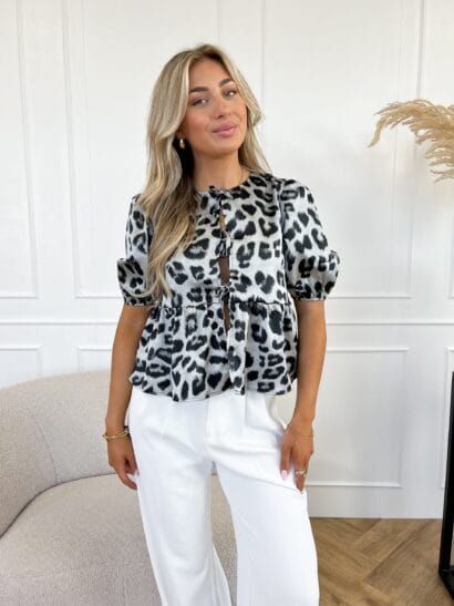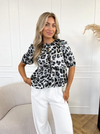 De Bowie top heeft een subtiele pofmouw en elastiek aan de onderkant van de mouw. De top loopt iets wijder uit aan de onderkant en heeft 3 verstelbare strikjes aan de voorkant.