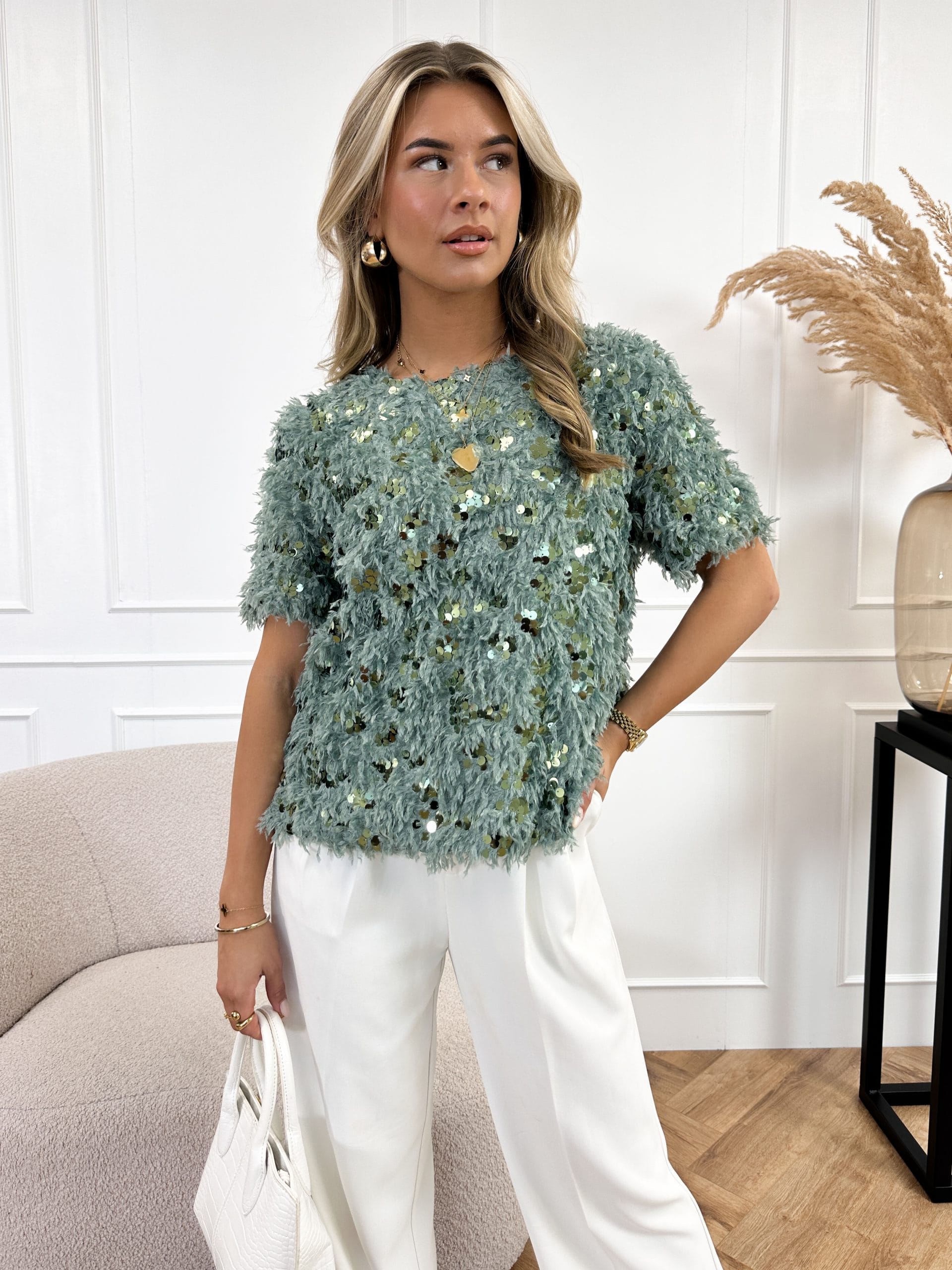 ‘Shine bright! De Noah top in groen, met veren en pailletten, is de perfecte musthave voor elke dag of een feestje. Combineer de top met onze favoriete Lovie witte pantalon en sneakers voor een casual look, of ga chique met hakken eronder.”
